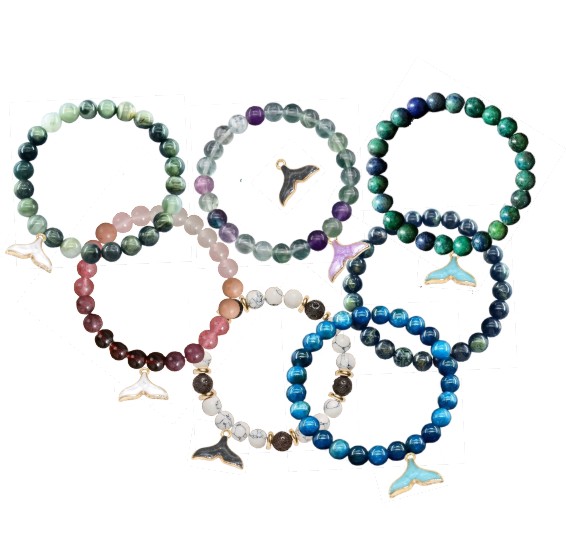 Bracelets Pierres Queue de Baleine B125 (pour 12) Charmants bracelets en pierres semi-précieuse assortis (bon choix) montrant une queue de baleine émaillée de couleurs pâle. Monté sur un élastique très solide pour bracelet. Original, ce souvenirs plaira sans aucun doute!